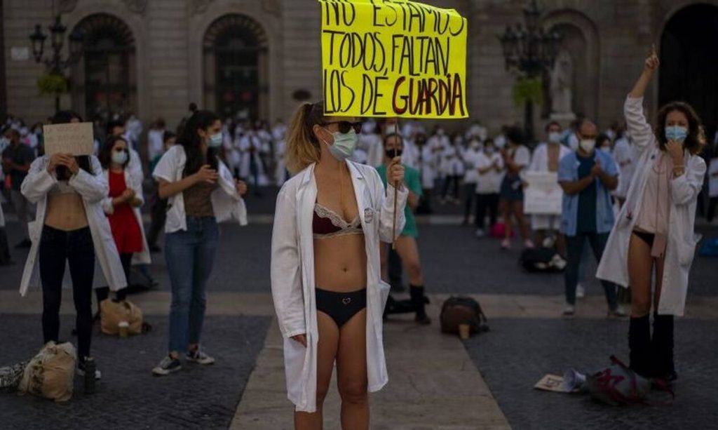 Πέρα από το γεγονός ότι έβγαλαν, σε μια συμβολική κίνηση για να δείξουν τη γύμνια του συστήματος υγείας, τις ιατρικές τους ρόμπες κρατούσαν και πλακάτ με διάφορα συνθήματα. «Δεν ντρέπεστε;» και «που είναι τώρα τα χειροκροτήματά σας;», έγραφαν μερικά από αυτά…