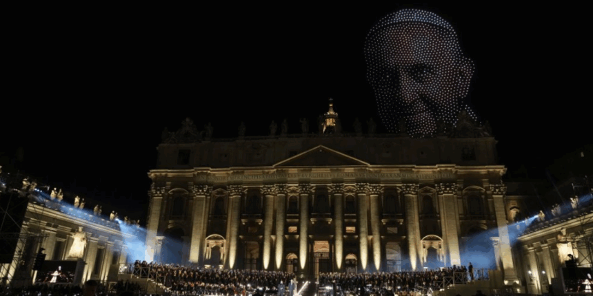 Το μεγάλο φινάλε της εκδήλωσης κορυφώθηκε με ένα εντυπωσιακό εναέριο θέαμα: 3.500 drones σχημάτισαν στον ουρανό το πρόσωπο του Πάπα Φραγκίσκου, την ώρα που στη σκηνή ακούγονταν οι νότες του Amazing Grace, σε ερμηνεία του Ιταλού τενόρου Andrea Bocelli και του Αμερικανού ράπερ Jelly Roll.