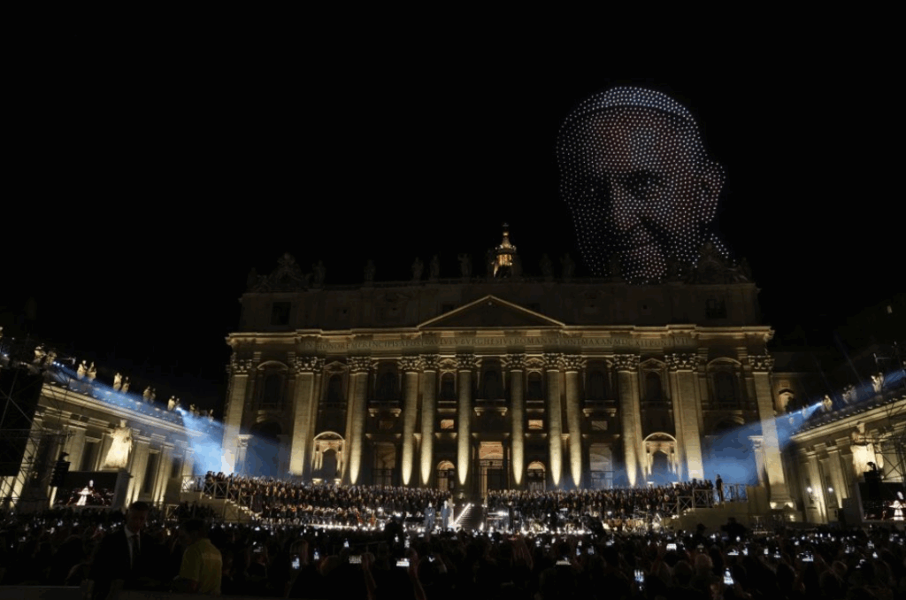 Το μεγάλο φινάλε της εκδήλωσης κορυφώθηκε με ένα εντυπωσιακό εναέριο θέαμα: 3.500 drones σχημάτισαν στον ουρανό το πρόσωπο του Πάπα Φραγκίσκου, την ώρα που στη σκηνή ακούγονταν οι νότες του Amazing Grace, σε ερμηνεία του Ιταλού τενόρου Andrea Bocelli και του Αμερικανού ράπερ Jelly Roll.
