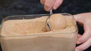 - Σκεπάζουμε με μια μεμβράνη να εφάπτεται πάνω στην κρέμα για να αποφύγουμε τα κρυσταλλάκια και βάζουμε το παγωτό στην κατάψυξη για 6-7 ώρες.