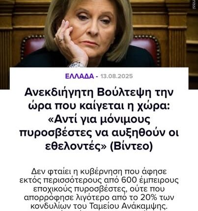 «Δεν έφτανε στους ανθρώπους της πυροσβεστικής και στους πυρόπληκτους ότι έμειναν αβοήθητοι, έχουν και την κυρία Βούλτεψη να βγαίνει στα κανάλια και να τους εξοργίζει ακόμα περισσότερο.