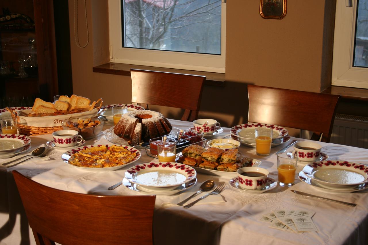 Φρέσκο βούτυρο σε ζεστό ψωμί, πίτες χωριάτικες, αυγά της περιοχής, μέλι και μαρμελάδες δικές τους, σπιτικά κέικ και τσάι του