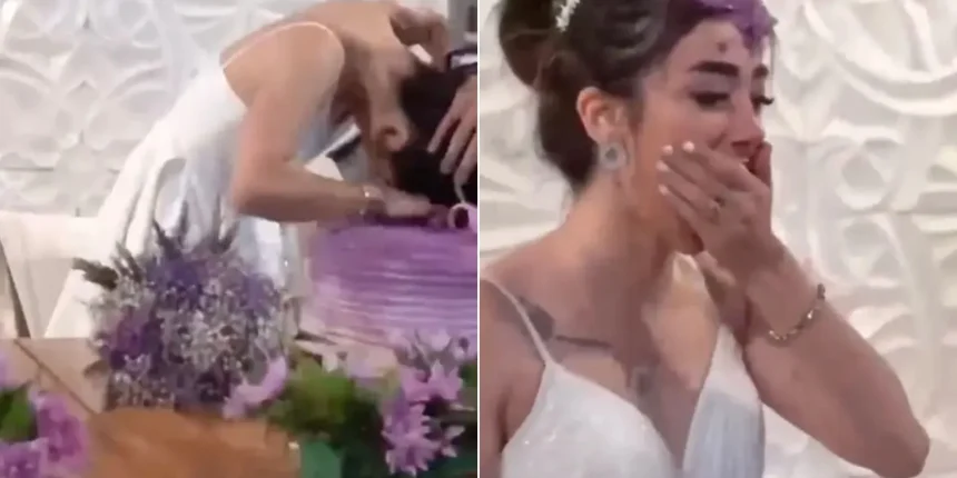 Το viral βίντεο δείχνει έναν άνδρα –του οποίου η ταυτότητα παραμένει άγνωστη– να σπρώχνει το κεφάλι της νύφης μέσα στην τούρτα του γάμου, με το μωβ γλάσο να καλύπτει ολόκληρο το πρόσωπό της.