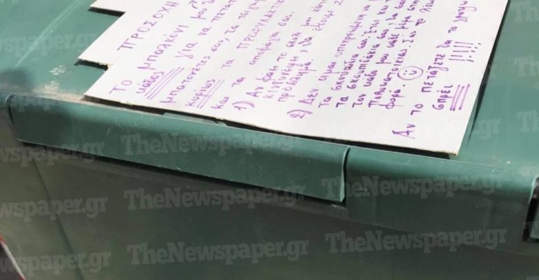 Η αγανακτισμένη κάτοικος έγραψε μία μεγάλη επιγραφή και την κόλλησε στον κάδο απορριμμάτων της γειτονιάς, ώστε να γίνει σαφές σε όλους οτι δεν πρόκειται να ανεχθεί άλλο αυτή την κατάσταση!