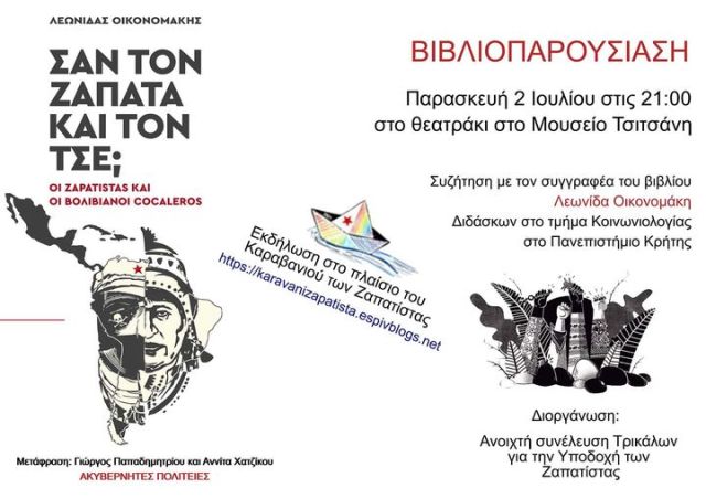 Στο πλαίσιο του Καραβανιού των Ζαπατίστας και των δράσεων για τον ερχομό τους στην Ευρώπη, η Ανοικτή Συνέλευση Τρικάλων για την Υποδοχή των Ζαπατίστας θα πραγματοποιήσει την Παρασκευή 2 Ιουλίου εκδήλωση – συζήτηση με τον συγγραφέα του βιβλίου «Σαν τον Ζαπάτα και τον Τσε; Οι Zapatistas και οι Βολιβιανοί cocaleros» (εκδόσεις «Ακυβέρνητες Πολιτείες»), διδάσκων στο Τμήμα Κοινωνιολογίας του Πανεπιστημίου Κρήτης, Λεωνίδα Οικονομάκη.