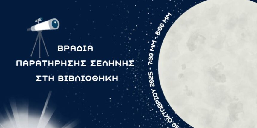 Την Πέμπτη 30 Οκτωβρίου 2025, στις 7:00 μ.μ., στον αύλειο χώρο της Βιβλιοθήκης, μικροί και μεγάλοι θα έχουμε την ευκαιρία να παρατηρήσουμε τη Σελήνη, μέσα από το τηλεσκόπιο της Βιβλιοθήκης, απολαμβάνοντας εντυπωσιακές λεπτομέρειες της επιφάνειάς της.