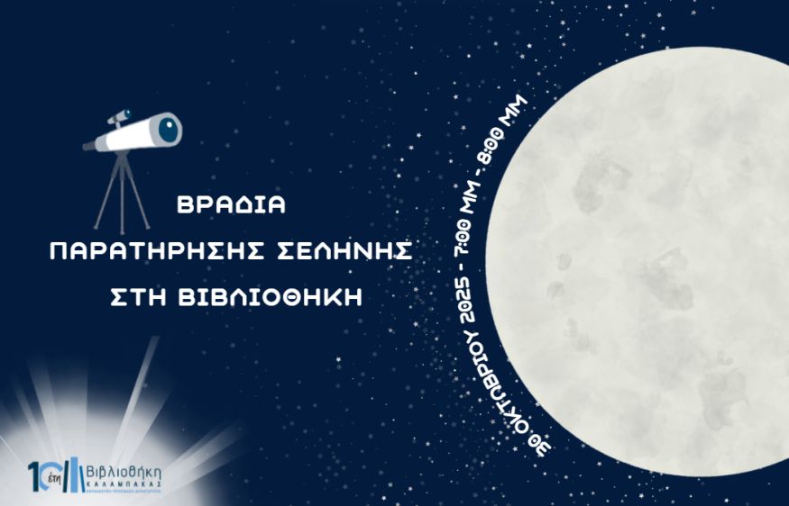 Την Πέμπτη 30 Οκτωβρίου 2025, στις 7:00 μ.μ., στον αύλειο χώρο της Βιβλιοθήκης, μικροί και μεγάλοι θα έχουμε την ευκαιρία να παρατηρήσουμε τη Σελήνη, μέσα από το τηλεσκόπιο της Βιβλιοθήκης, απολαμβάνοντας εντυπωσιακές λεπτομέρειες της επιφάνειάς της.