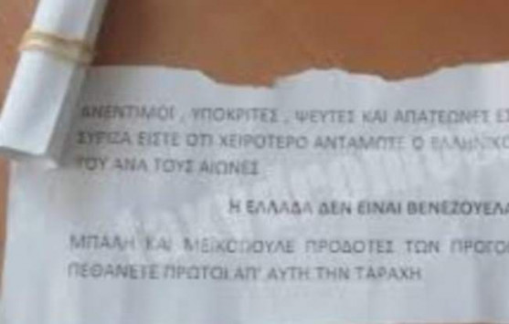 Υβριστικά και απειλητικά σημειώματα εναντίον δύο βουλευτών Μαγνησίας του ΣΥΡΙΖΑ, βρέθηκαν προχθές το μεσημέρι πεταμένα έξω από τα γραφεία της εφημερίδας Ταχυδρόμος του Βόλου. Ο αγνωστος δράστης καταφέρεται εναντίον των δύο εκ των τριών Βουλευτών Μαγνησίας του ΣΥΡΙΖΑ, Μάκη Μπαλλή και Αλ. Μεϊκόπουλου. Το διπλό απειλητικό σημείωμα ήταν γραμμένο σε υπολογιστή και τυπωμένο σε χαρτί Α4. Ηταν τυλιγμένα σε μικρούς κυλίνδρους και πιασμένα με λάστιχο. Βρέθηκαν πεταμένα μπροστά από την κεντρική πόρτα των γραφείων της εφημερίδας απέναντι από το ασανσέρ. Ξετυλίγοντας το χαρτί, διάβαζε κανείς το μήνυμα: «Ανέντιμοι, υποκριτές, ψεύτες και απατεώνες εσείς υποστηρικτές του ΣΥΡΙΖΑ είστε ό,τι χειρότερο αντάμωσε ο ελληνικός λαός, στη δίνη ανά τους αιώνες. Η Ελλάδα δεν είναι Βενεζουέλα. Μπαλή και Μεϊκόπουλε προδότες των προγόνων σας εσείς θα πεθάνετε πρώτοι απ’ αυτή την ταραχή».