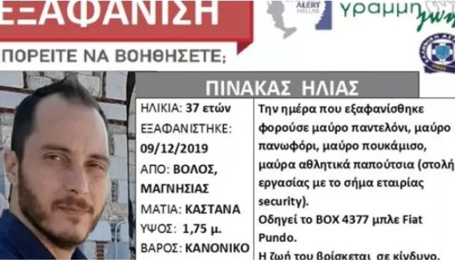 Βρέθηκε καλά στην υγεία του ο 37χρονος Ηλίας Πινάκας, του οποίου η τύχη αγνοούνταν από τη Δευτέρα 9 Δεκεμβρίου, όταν έφυγε από την εργασία του αλλά δεν επέστρεψε ποτέ στο σπίτι.