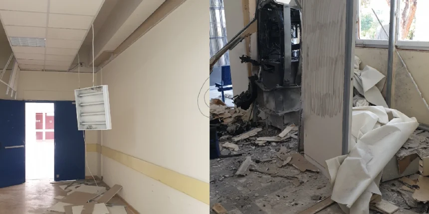 Από την έκρηξη έσπασαν η πόρτα του νοσοκομείου και τζαμαρίες, ενώ προκλήθηκαν πολλές ζημιές στο ισόγειο και τον πρώτο όροφο αφού από το ωστικό κύμα έπεσαν μέχρι και ψευδοροφές.