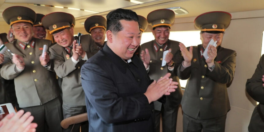 Φωτογραφίες που δημοσιεύθηκαν στην εφημερίδα Rodong Sinmun δείχνουν έναν χαμογελαστό Κιμ — περιτριγυρισμένο από ένστολους αξιωματούχους — να πανηγυρίζει καθώς παρακολουθεί αυτό που περιγράφεται ως δοκιμαστική βολή του όπλου.
