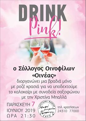 Οπως αναφέρεται στη σχετική ανακοίνωση ο Σύλλογος Οινοφίλων “Οινέας” διοργανώνει μια βραδιά μόνο με ροζέ κρασιά για να υποδεχτούμε το καλοκαίρι με συνοδεία σαξοφώνου με την Χριστίνα Μπαλλά.