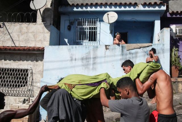 Δεκαοκτώ άνθρωποι έχασαν τη ζωή τους χθες Πέμπτη σε αστυνομική επιχείρηση κατά του οργανωμένου εγκλήματος σε φαβέλα του Ρίο ντε Τζανέιρο, όπως ανακοίνωσαν οι αρχές της βραζιλιάνικης μεγαλούπολης (στις φωτογραφίες του Reuters/Ricardo Moraes, επάνω και κάτω, κάτοικοι μεταφέρουν τους νεκρούς και τους τραυματίες τυλιγμένους σε πρόχειρα σεντόνια).