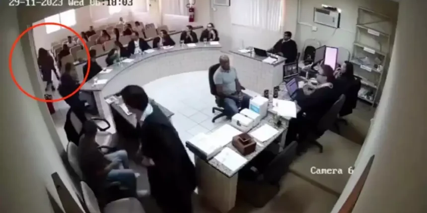 Πλάνα από το εσωτερικό της αίθουσας του δικαστηρίου δείχνουν τον Terto να ορμά με ένα περίστροφο διαμετρήματος 38 χιλιοστών προς τον De Moura – ο οποίος κάθεται λίγα βήματα μακριά από έναν ένορκο και έναν δικηγόρο – και να πυροβολεί τουλάχιστον δύο φορές.