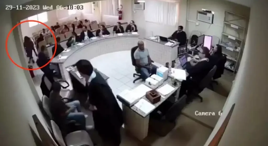 Πλάνα από το εσωτερικό της αίθουσας του δικαστηρίου δείχνουν τον Terto να ορμά με ένα περίστροφο διαμετρήματος 38 χιλιοστών προς τον De Moura – ο οποίος κάθεται λίγα βήματα μακριά από έναν ένορκο και έναν δικηγόρο – και να πυροβολεί τουλάχιστον δύο φορές.