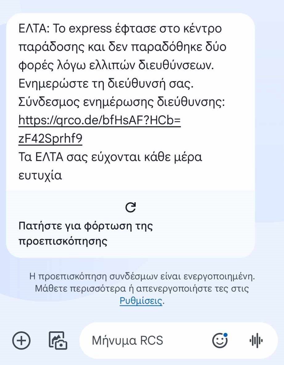 Το μήνυμα που φτάνει αναφέρει ότι είναι από τα ΕΛΤΑ και ότι ψαχνουν να βρουν τον παραλήπτη πακέτων καθώς δεν μπόρεσαν να βρούν τη διεύθυνση, ζητώντας να ατήσουν σε σχετικό link.
