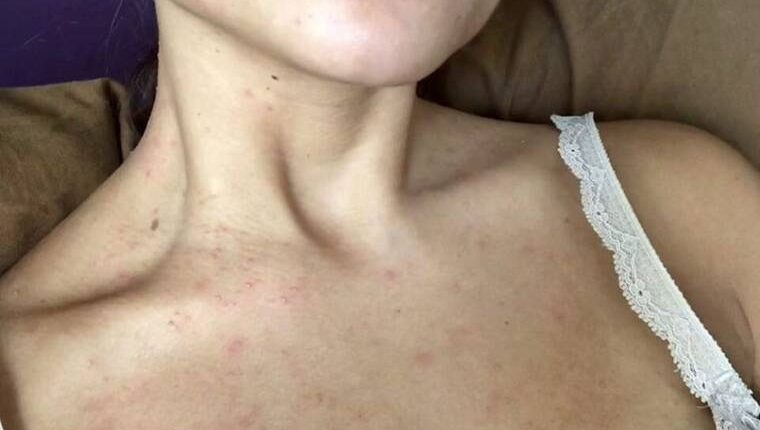 Η όμορφη τραγουδίστρια έγραψε στη λεζάντα της φωτογραφίας που ανέβασε στην οποία απεικονίζεται η ίδια εντελώς άβαφη και με κάτι κοκκινίλες σε όλο της το σώμα: