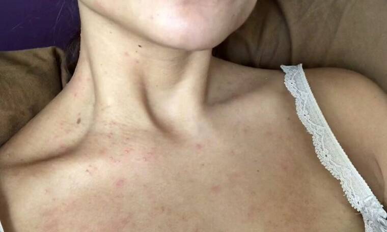 Η όμορφη τραγουδίστρια έγραψε στη λεζάντα της φωτογραφίας που ανέβασε στην οποία απεικονίζεται η ίδια εντελώς άβαφη και με κάτι κοκκινίλες σε όλο της το σώμα: