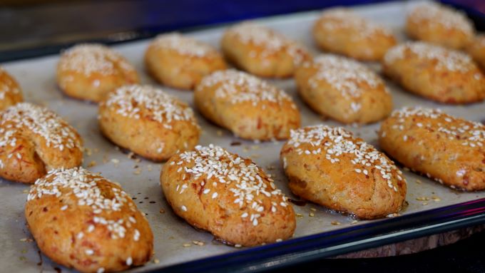 4. Μετράμε 50 γρ. το κάθε κομμάτι τα πλάθουμε σε οβάλ σχήμα και τα βάζουμε σε ταψί με λαδόκολλα.