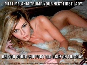 «Ξεκατινιάζονται» οι δύο επικρατέστεροι υποψήφιοι των Ρεπουμπλικάνων στις ΗΠΑ, στον αγώνα τους για να λάβουν το πολυπόθητο χρίσμα. Μια οργάνωση που υποστηρίζει ότι δεν συνδέεται με τον Τεντ Κρουζ και ονομάζεται “Make America Awesome” πόσταρε στο facebook γυμνές φωτογραφίες της σέξι συζύγου του Ντόναλντ Τραμπ, Μελάνια Κνάους.