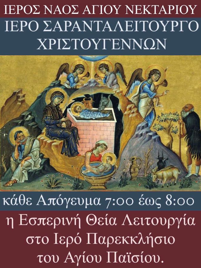 Παρακαλούμε όσοι επιθυμούν να συμμετάσχουν στο Ιερό Σαρανταλείτουργο να μας προσκομίσετε τα ονόματα υπέρ Υγείας και υπέρ Αναπαύσεως προκειμένου να σας μνημονεύσουμε στο Ιερό Χριστουγενιάτικο Σαρανταλείτουργο.