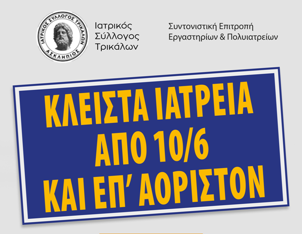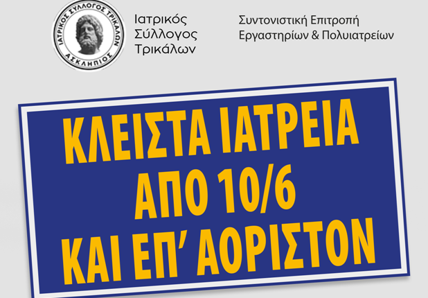 Ο Ιατρικός Σύλλογος Τρικάλων στηρίζει την κινητοποίηση των Ιατρών Μικροβιολόγων και ζητά την κατανόηση των ασφαλισμένων για την ταλαιπωρία που θα υποστούν.