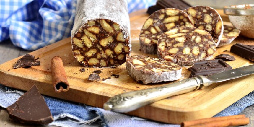 Κόβουμε το γλυκό σαλάμι ψυγείου σε φέτες.