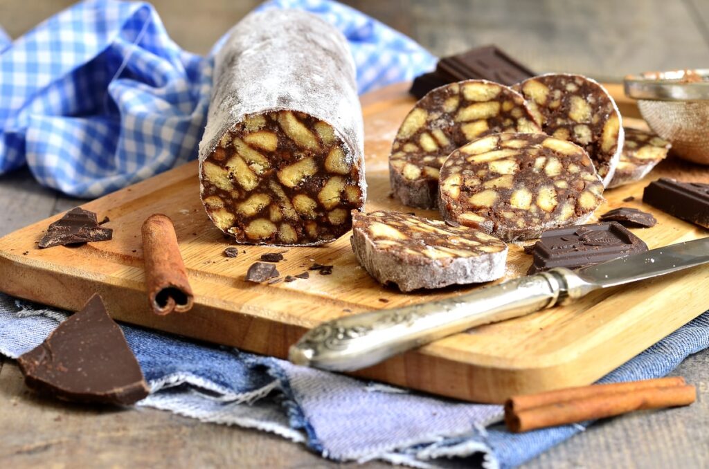 Κόβουμε το γλυκό σαλάμι ψυγείου σε φέτες.