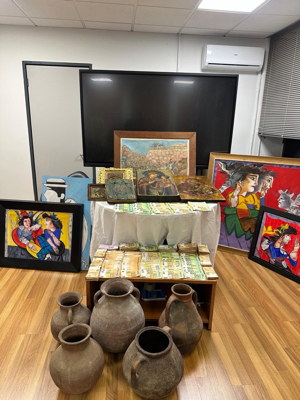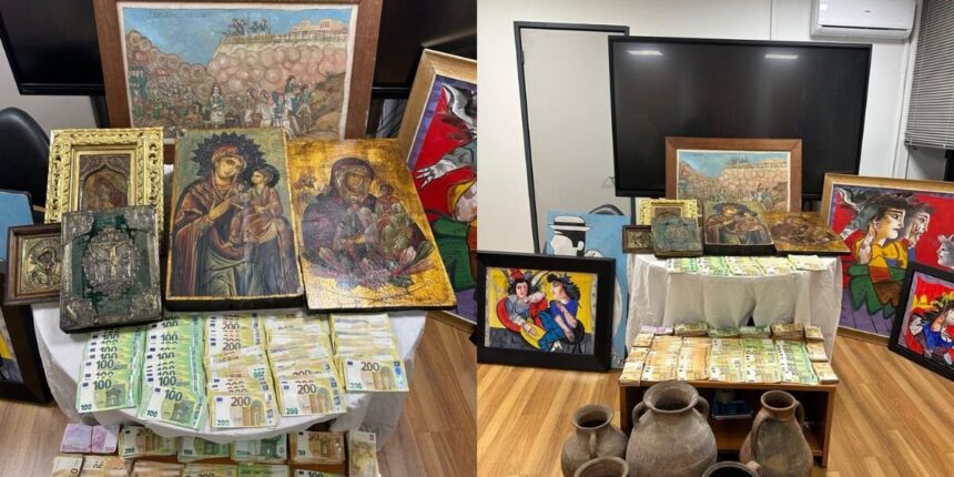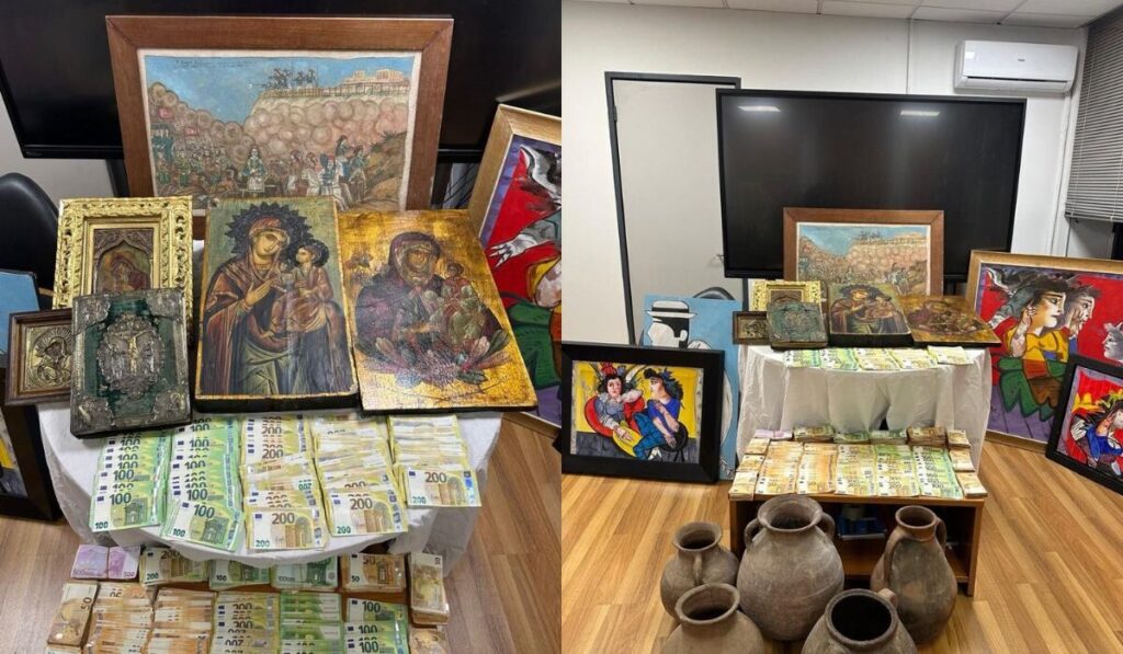 Κατά τη διάρκεια των ερευνών κατασχέθηκαν συνολικά 190.000 ευρώ σε μετρητά, καθώς και αμφορείς, βυζαντινές εικόνες και πλήθος από πίνακες ζωγραφικής.