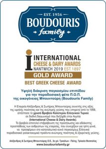 Η Εταιρεία Αλέξανδρος και Σωτήριος Μπουντούρης συνεπής στις αξίες της υψηλής ποιότητας και της ανώτερης γεύσης που υπηρετεί από το 1956, απέσπασε το χρυσό Βραβείο Καλύτερου Ελληνικού Τυριού σε διεθνή διαγωνισμό που διεξήχθη στην Αγγλία (International Cheese & Dairy Awards).
