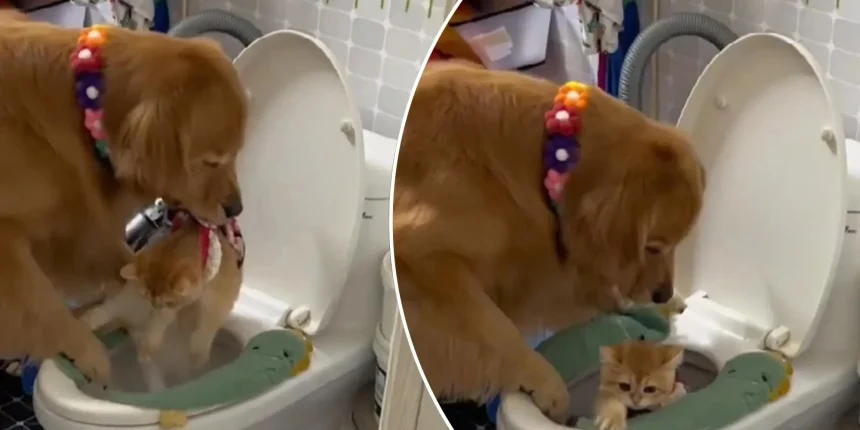 Το χαριτωμένο Golden Retriever, βλέποντας τον ιδιοκτήτη του να αγκαλιάζει την γάτα και όχι εκείνο, πήρε το μικρό γατάκι και το έριξε στην τουαλέτα.