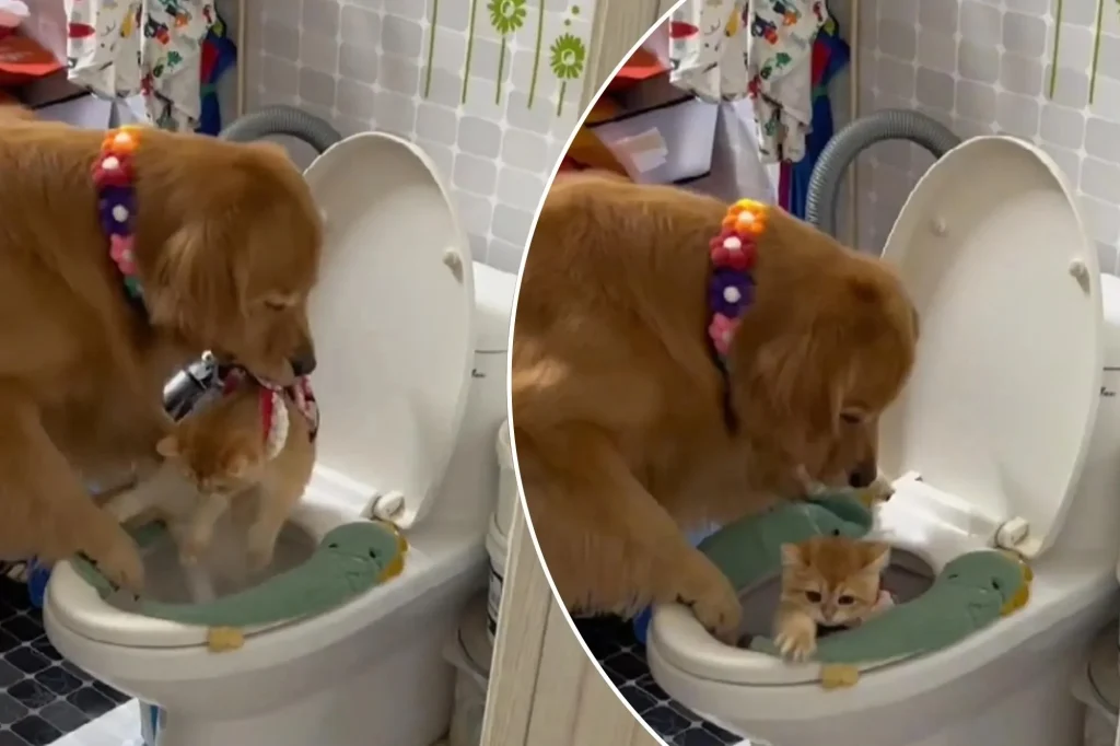 Το χαριτωμένο Golden Retriever, βλέποντας τον ιδιοκτήτη του να αγκαλιάζει την γάτα και όχι εκείνο, πήρε το μικρό γατάκι και το έριξε στην τουαλέτα.