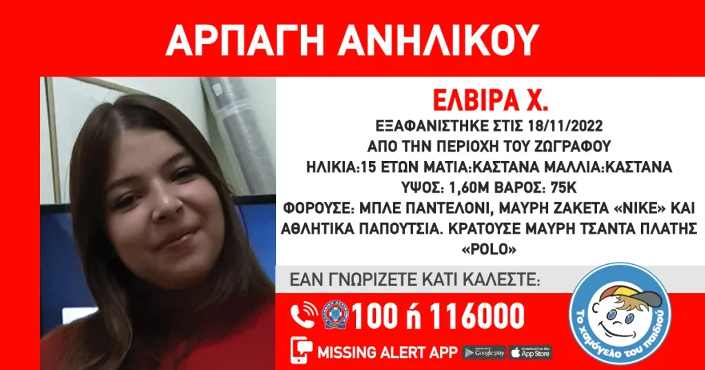 Η δημοσιοποίηση των στοιχείων της, αποσκοπεί στη συνδρομή όλων μας στον έγκαιρο εντοπισμό της, προκειμένου να επιστρέψει με ασφάλεια στην οικογένεια της.
