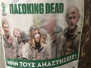 Στην αφίσα της φοιτητικής παράταξης της ΚΝΕ εμφανίζονται με μορφή ζόμπι η Φώφη Γεννηματά, ο Ευάγγελος Βενιζέλος και ο Γιώργος Παπανδρέου, εν όψει των εκλογών στις 24 Μαΐου.